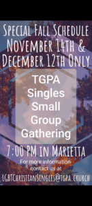 Contact us @ LGBTChristianSingles@tgpa.church for location details and more information